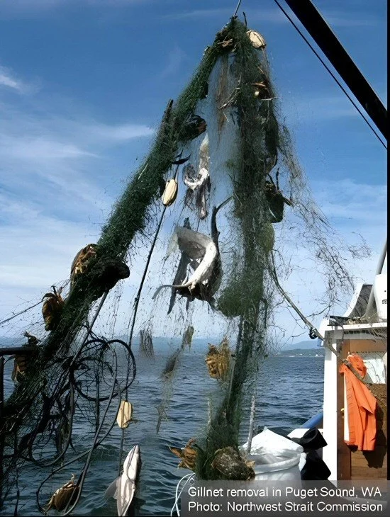 Chemicals, such as mercury, polychlorinated biphenyls (PCBs), dichloro-diphenyl-trichloroethane (DDT) and many other substances, accumulate in the skin, fat, internal organs and muscle tissue of fish, some of which do not break down. These “forever chemicals” are absorbed by small fish who are eaten by larger fish, seals, porpoises, dolphins and whales. These toxins accumulate as they move along the food chain, a process known as “biomagnification,” with especially devastating effects on all the top predators in the ocean, particularly on mammal-eating orcas.