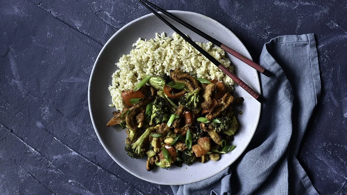 Soy curls are a great substitute for chicken in this plant-based recipe. They’re chewy, roasted on the outside, soft on the inside, and they soak up the wonderful flavors of the marinade-sauce. Even without oil, the roasting method works perfectly and yields a lot of color to the soy curls and vegetables. My favorite part is the peanuts!