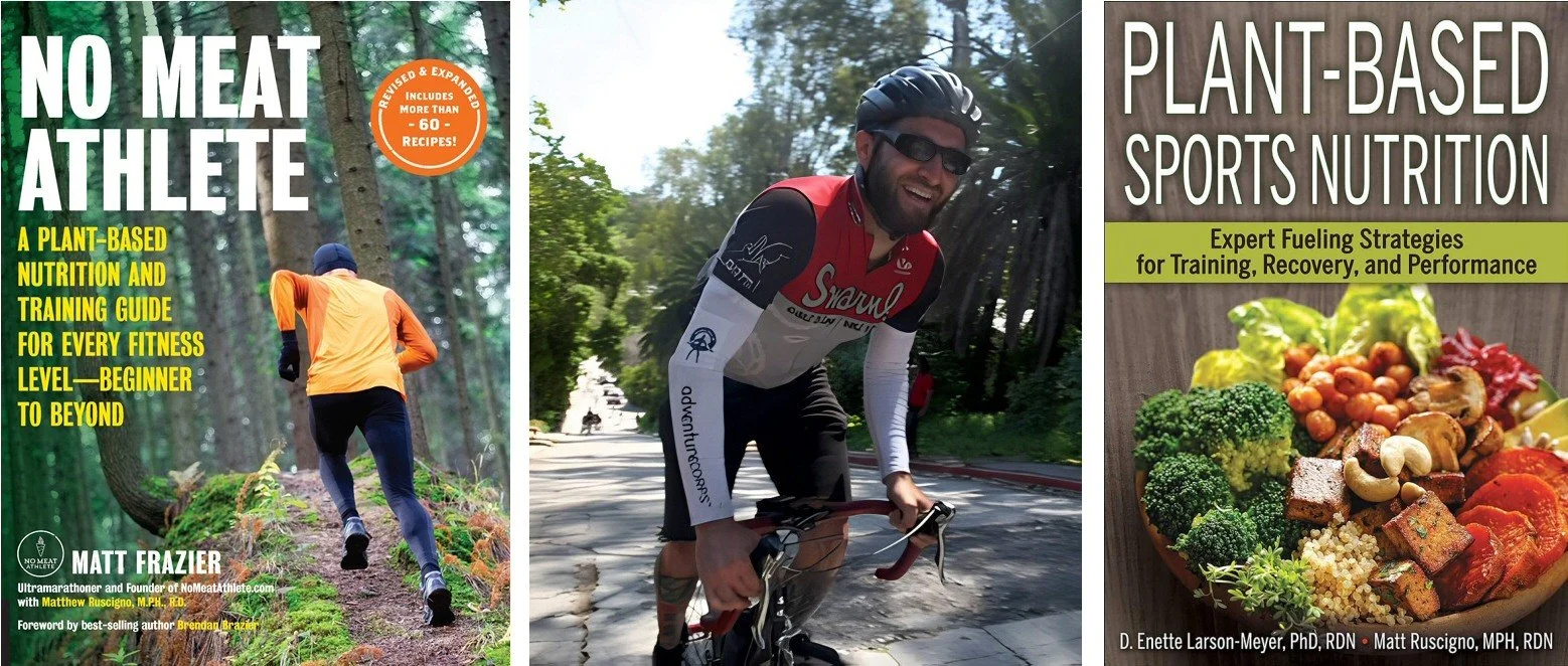 Endurance athlete Matt Ruscigno MPH RD on his bike, and two books he co-authored.