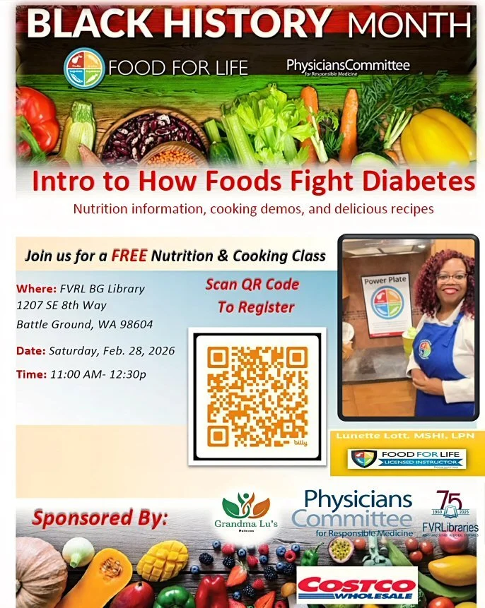 The road to diabetes does not have to be a one-way street. There is reason for hope! People who eat plant-based meals are less likely to ever develop diabetes, and for those who have diabetes, plant-based meals can help to improve blood sugar levels and prevent complications. These meals are affordable and can be quite delicious and satisfying. A low-fat, plant-based approach offers a new tool that many have found to be very useful. Review the latest science behind this approach, consider some simple ideas for getting started, sample four dishes, and explore useful resources. Register Here. This free nutrition and cooking class is presented by PCRM Food for Life Instructor Lunette Lott, MSHI, LPN, of Grandma Lu’s Wellness.