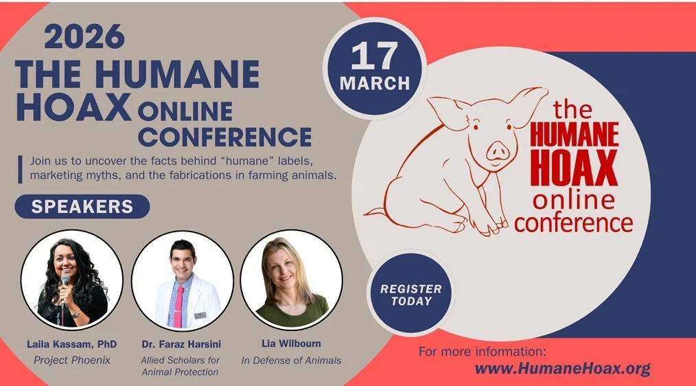 The Humane Hoax Online Conference examines how humanewashing functions across all farmed animal industry. The expert speakers will explore the critical role of language and narratives in animal advocacy and how the humane hoax helps justify harm. Humanewashing is usually discussed in terms of misleading labels or marketing. This year we dive deeper and explore the broader narrative of animal advocacy, look at the critical role of language and how it helps shape how harm is understood and justified. We will examine how the humane hoax functions across all animal industry. By recognizing the limits and harms of common narratives, we can develop new frameworks that normalize veganism and show how ending animal exploitation is an ethical imperative. We will explore the topic with a critical eye and challenge this growing trend.